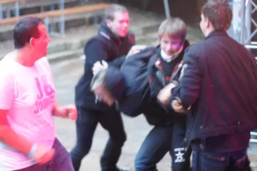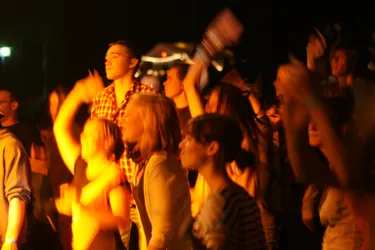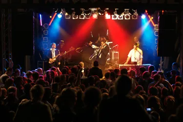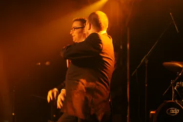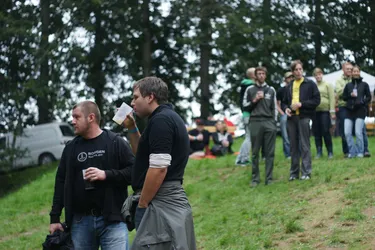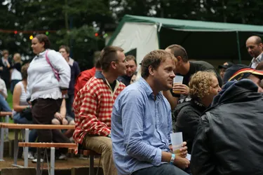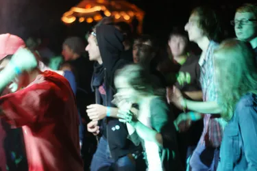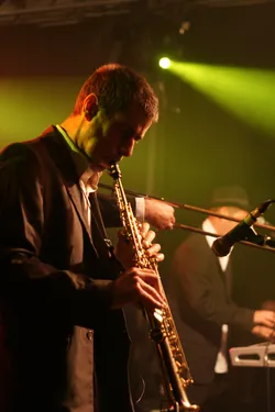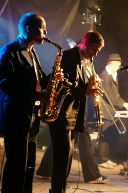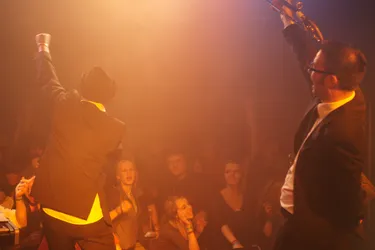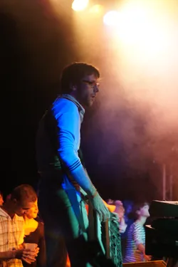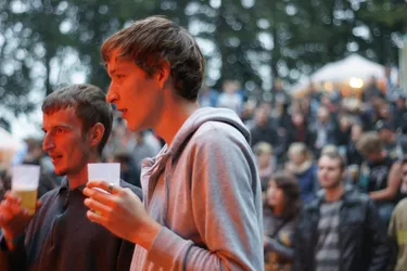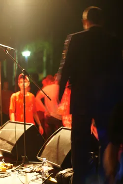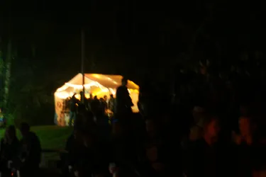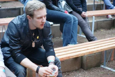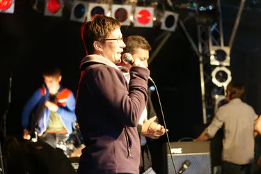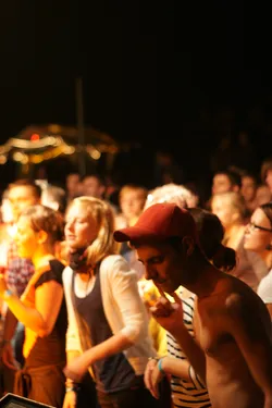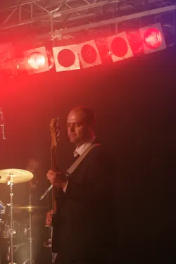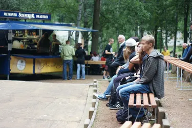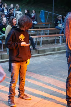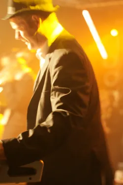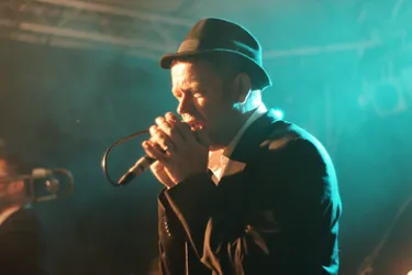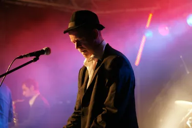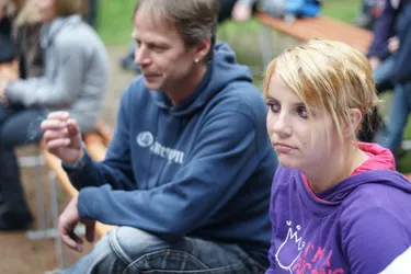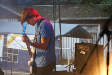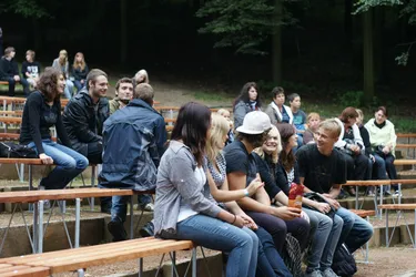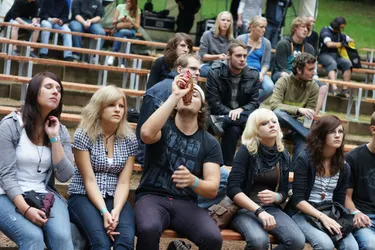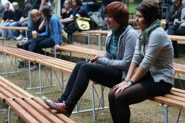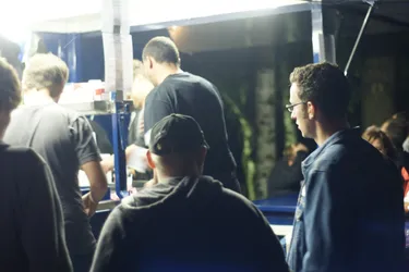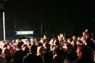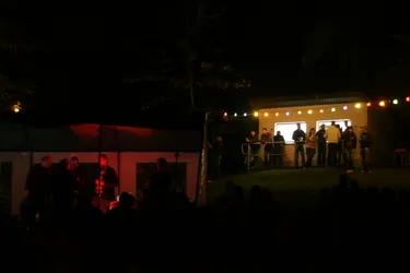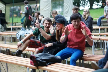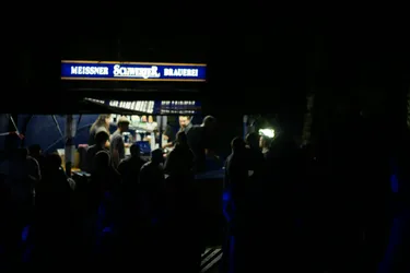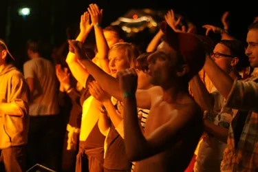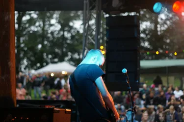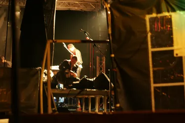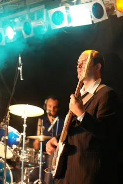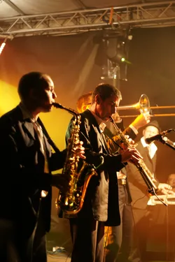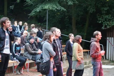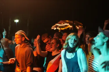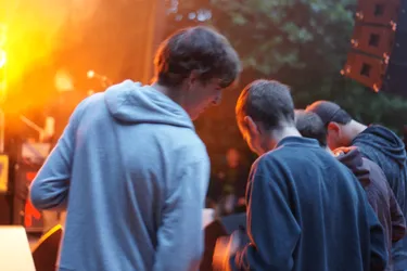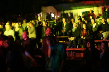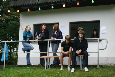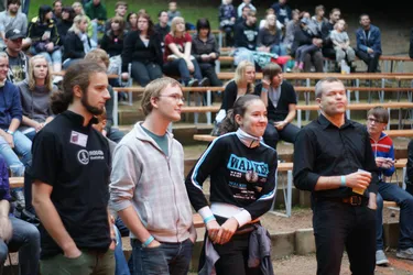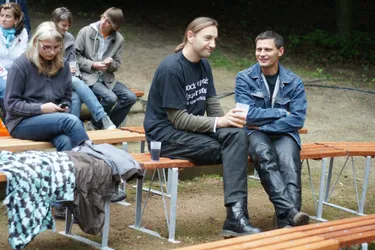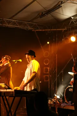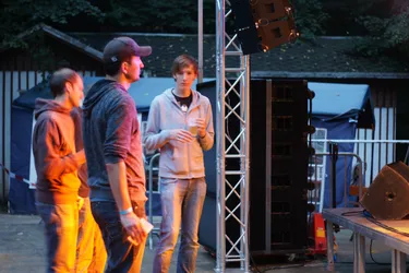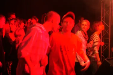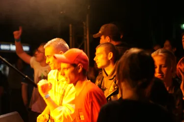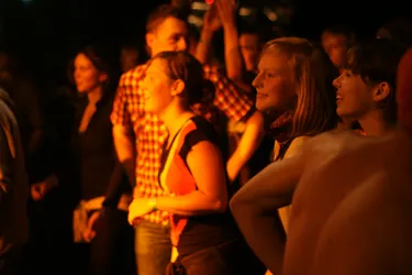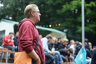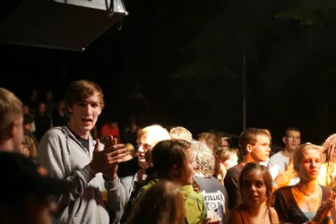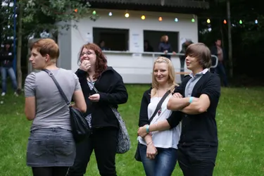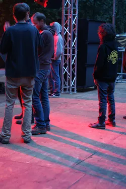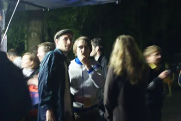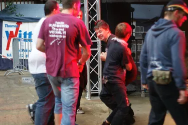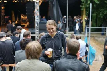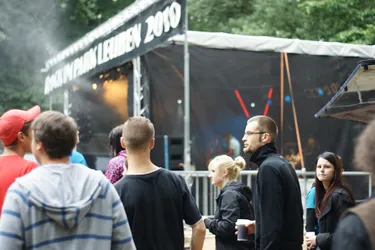 Noch während des Soundchecks erzählt Jens Strohschnieder am Bühnenrand die Geschichte von einem Festival mit ähnlich cooler Lage: ein Amphitheater an einem steilen, grasbewachsenen Hang im Ruhrpott. Bei Regen sei die Band dort in voller Montur, also in schwarzen Anzügen und weißen Hemden auf der schlammigen Wiese herumgetollt und den ganzen Hang im Schlamm heruntergerutscht. „Der Hang hier hat also noch sehr viel Potenzial!" sagt er mit schelmischem Blick auf die steile Wiese in Leuben, auf deren oberen Rand die Lichterkette mit den bunten Partylichtern vergnügt im Takt der Musik wackelt.